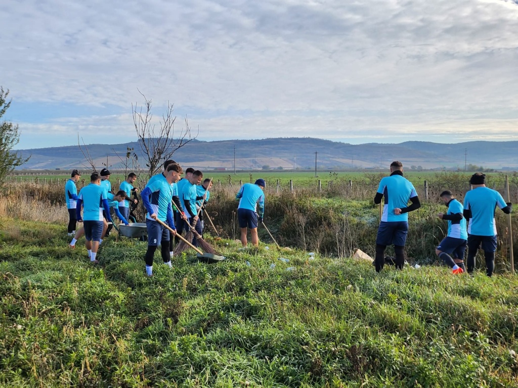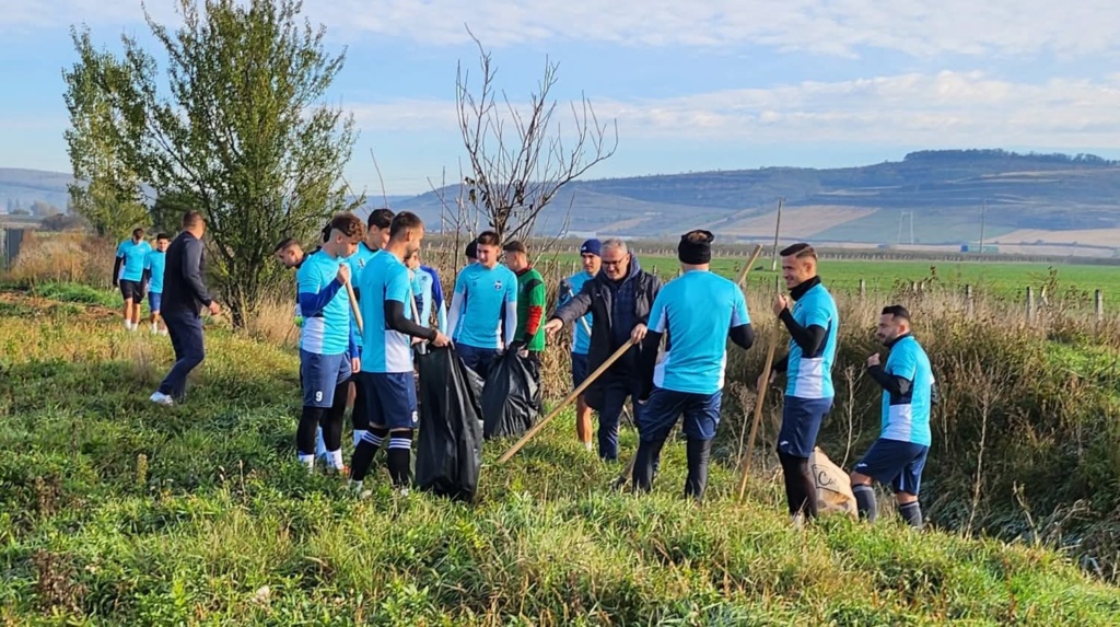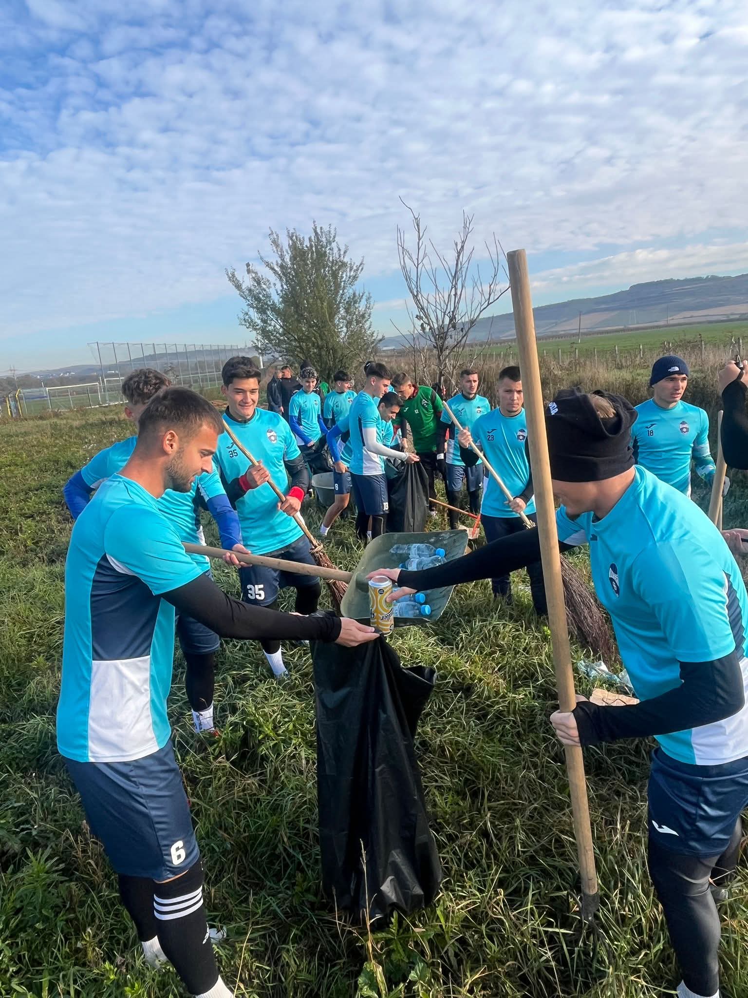 După un antrenament intens, fotbaliștii au pornit cu entuziasm într-o cursă neobișnuită: „vânătoarea” de PET-uri și deșeuri aruncate în natură. Echipați cu mănuși și saci, aceștia au alergat printre tufe, au făcut sprinturi pentru a recupera plasticul și au descoperit că „recuperarea” capătă un nou sens atunci când vine vorba de protejarea mediului.